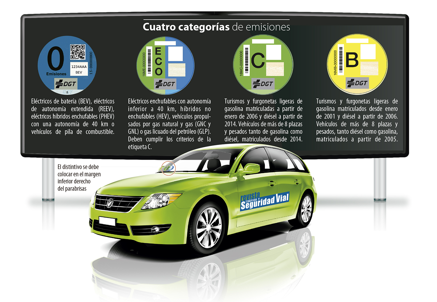 El mejor lugar es el ángulo inferior derecho del parabrisas delantero y, en su defecto, en cualquier lugar visible del vehículo.